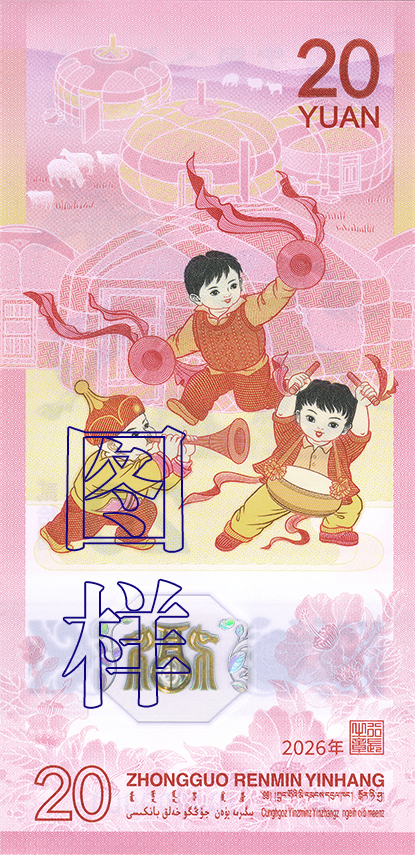 Back (Reverse): The primary motif depicts children celebrating with gongs and drums, complemented by Mongolian yurt decorative patterns. The upper portion shows the denomination “20” and the Pinyin “YUAN.” The lower portion features floral motifs, dynamic holographic patterns, the year “2026,” the Governor’s seal, and the denomination “20.” It also includes the Pinyin for “People’s Bank of China” and the bank’s name and denomination “Twenty Yuan” written in four ethnic minority languages: Mongolian, Tibetan, Uyghur, and Zhuang.