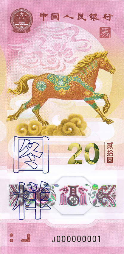 Front (Obverse): The main design features a stylized Horse. The top section displays the National Emblem of the PRC, the “People’s Bank of China” inscription, and a seal with the Chinese character for “Horse” in Seal Script. The lower section includes an OVI (Optical Variable Ink) denomination “20” and the Chinese “贰拾圆,” dynamic holographic patterns, a transparent window, braille denomination markings, and the banknote serial number.