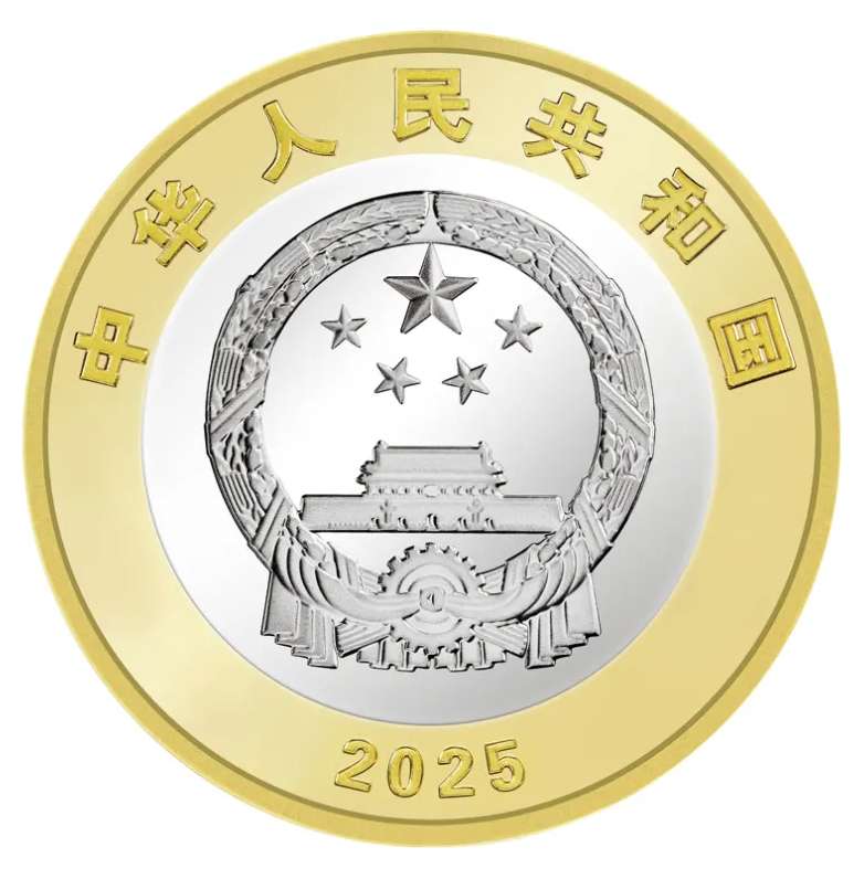 Obverse: The obverse design of the bimetallic copper alloy commemorative coin features the national emblem of the People’s Republic of China. The inscription “People’s Republic of China” appears above the emblem, with the year “2025” inscribed below.
